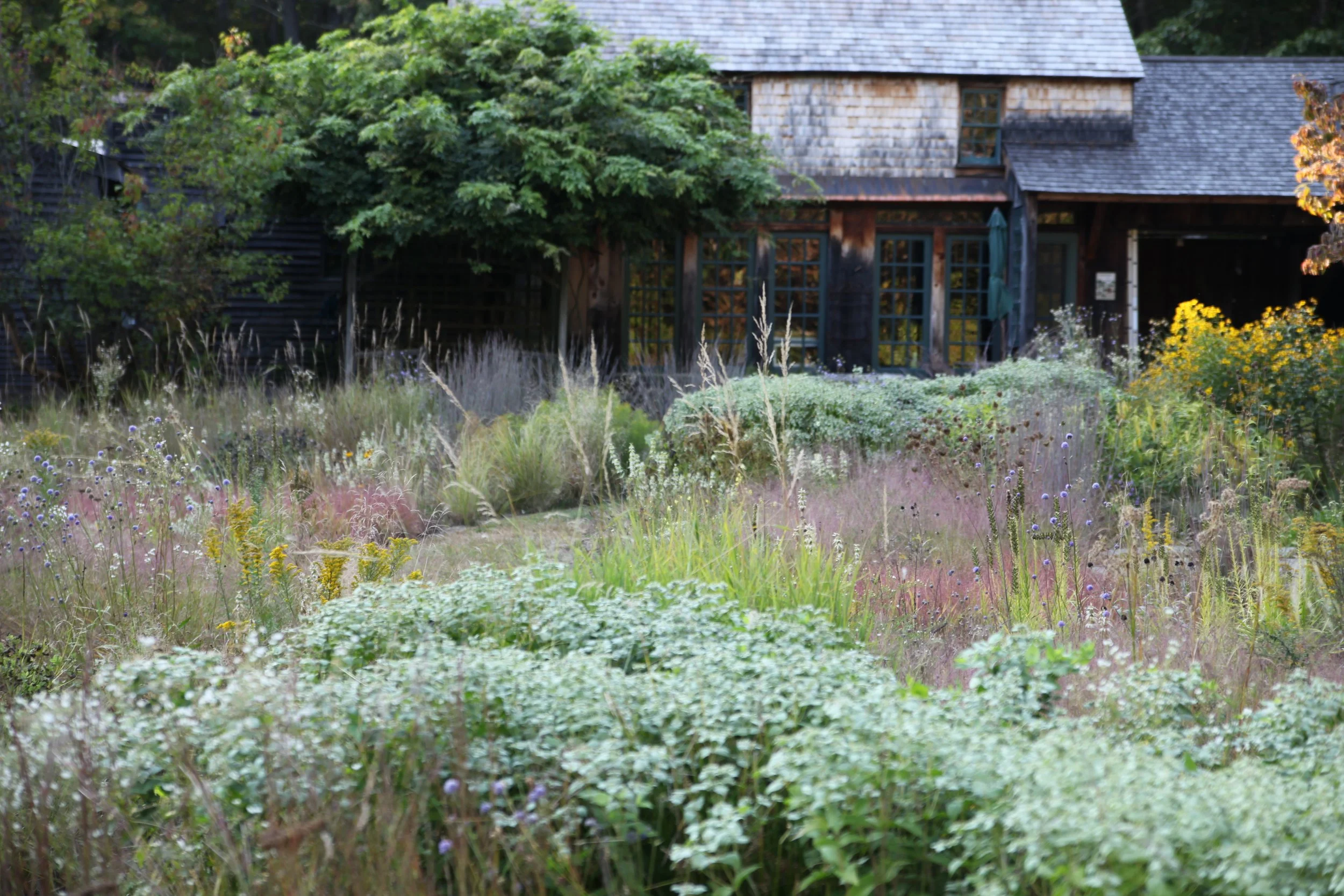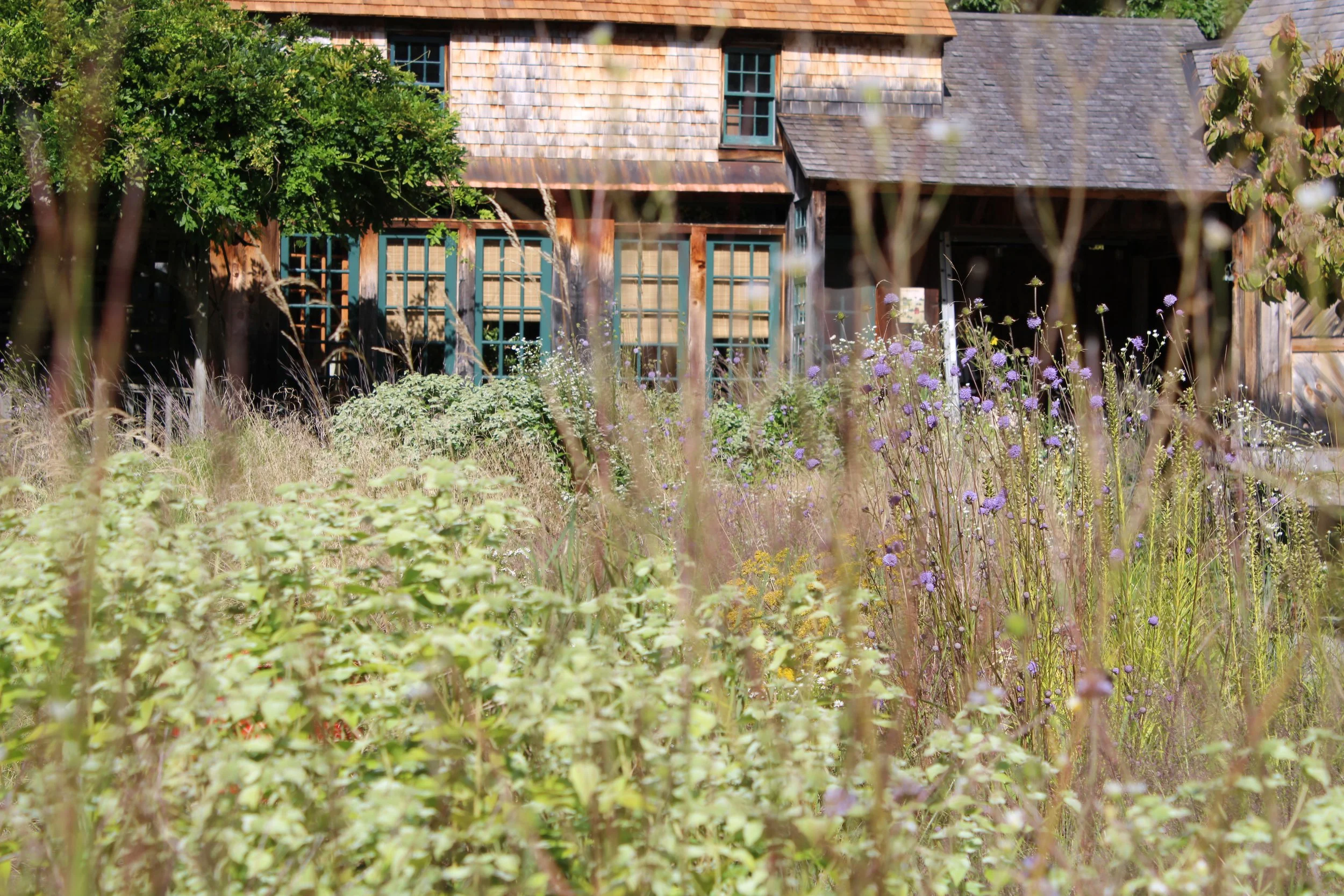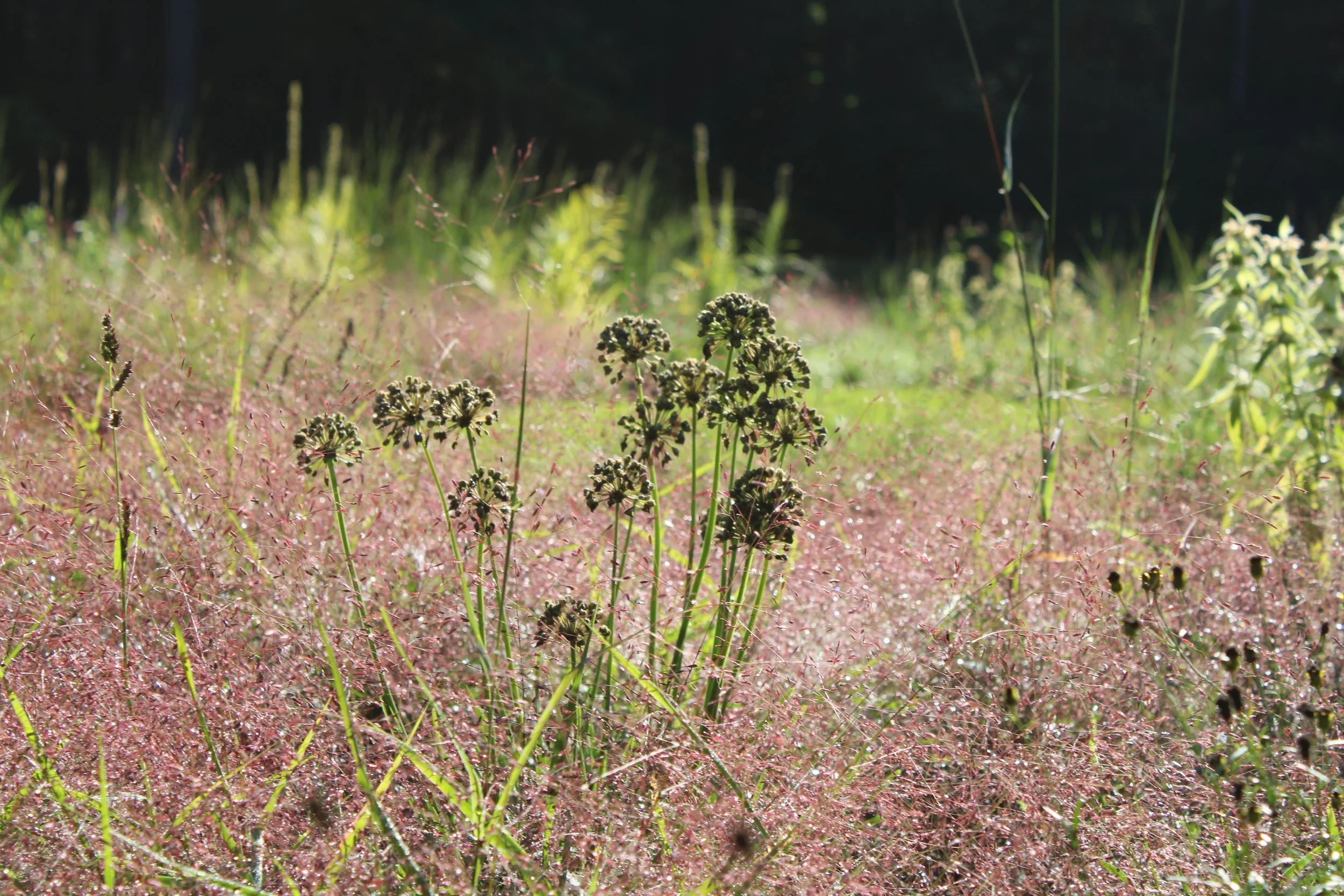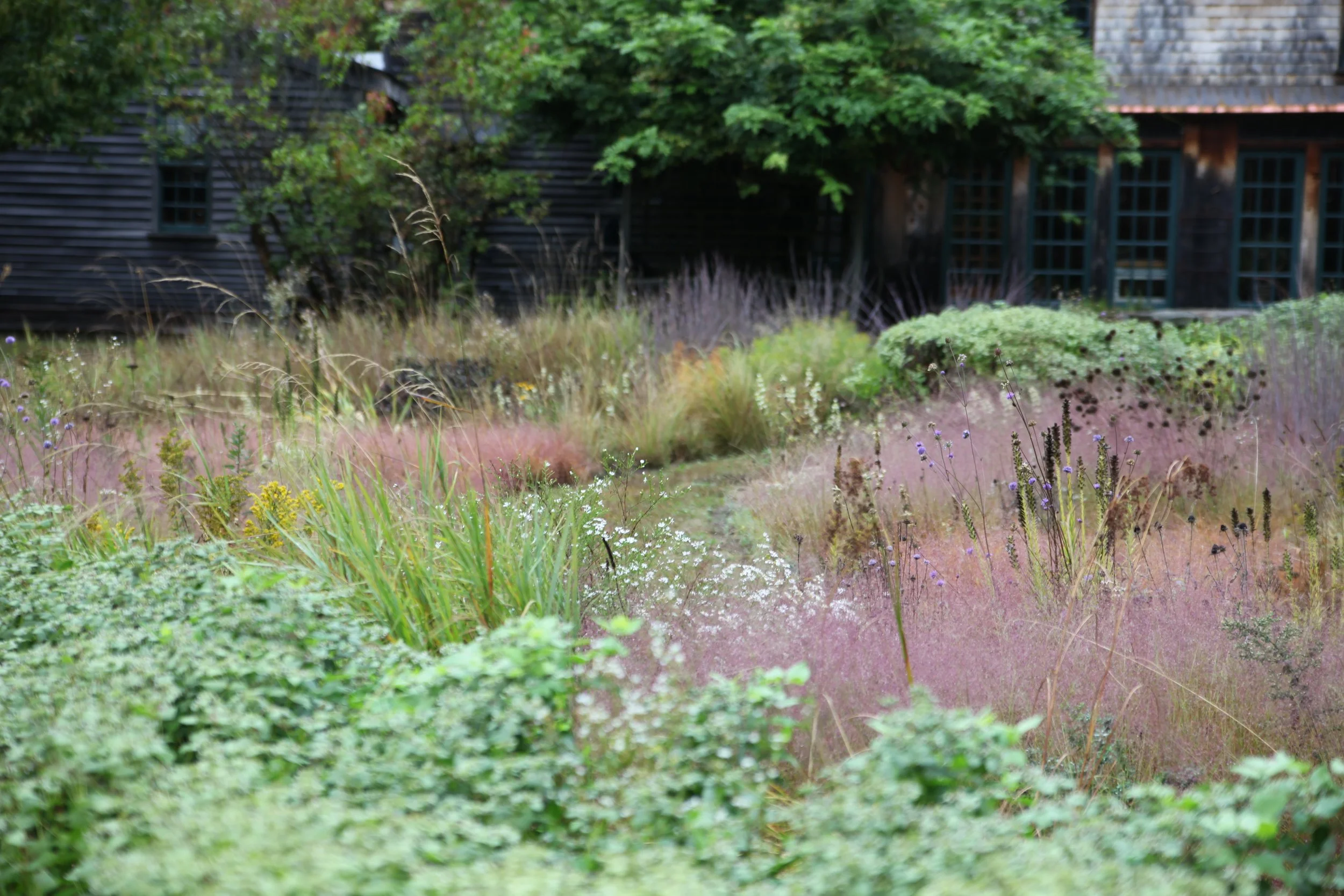 Aerial view of a backyard lawn that is being transformed into a naturalistic meadow with a winding path, surrounded by trees and houses.
