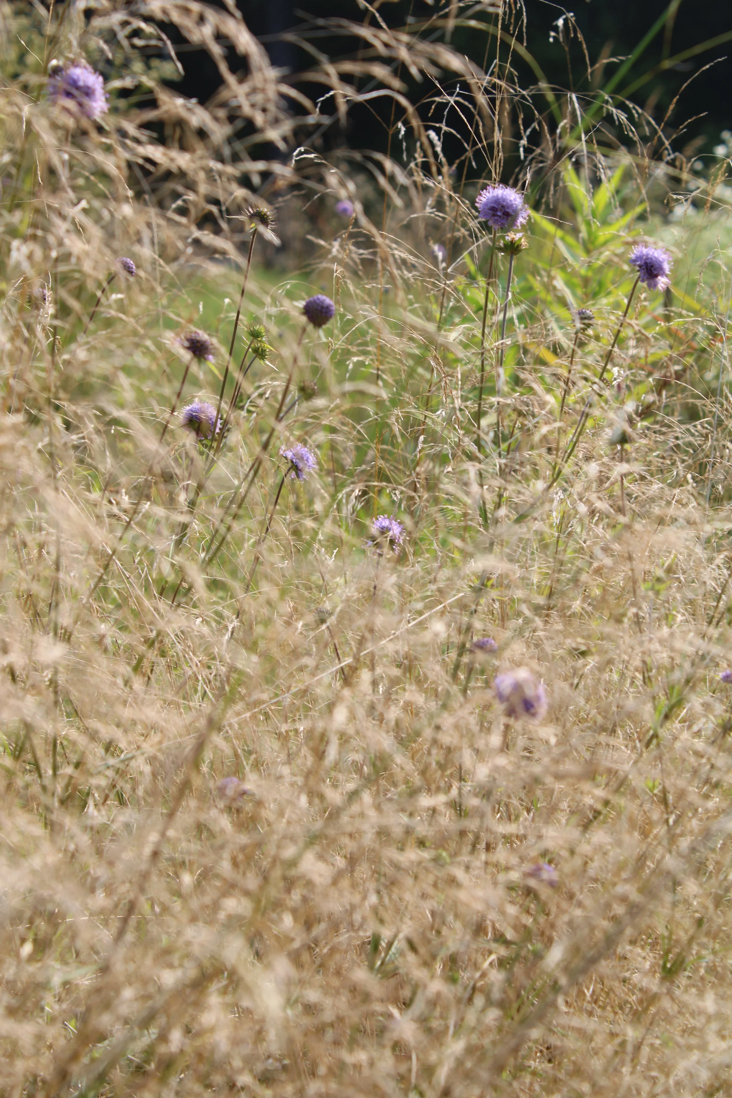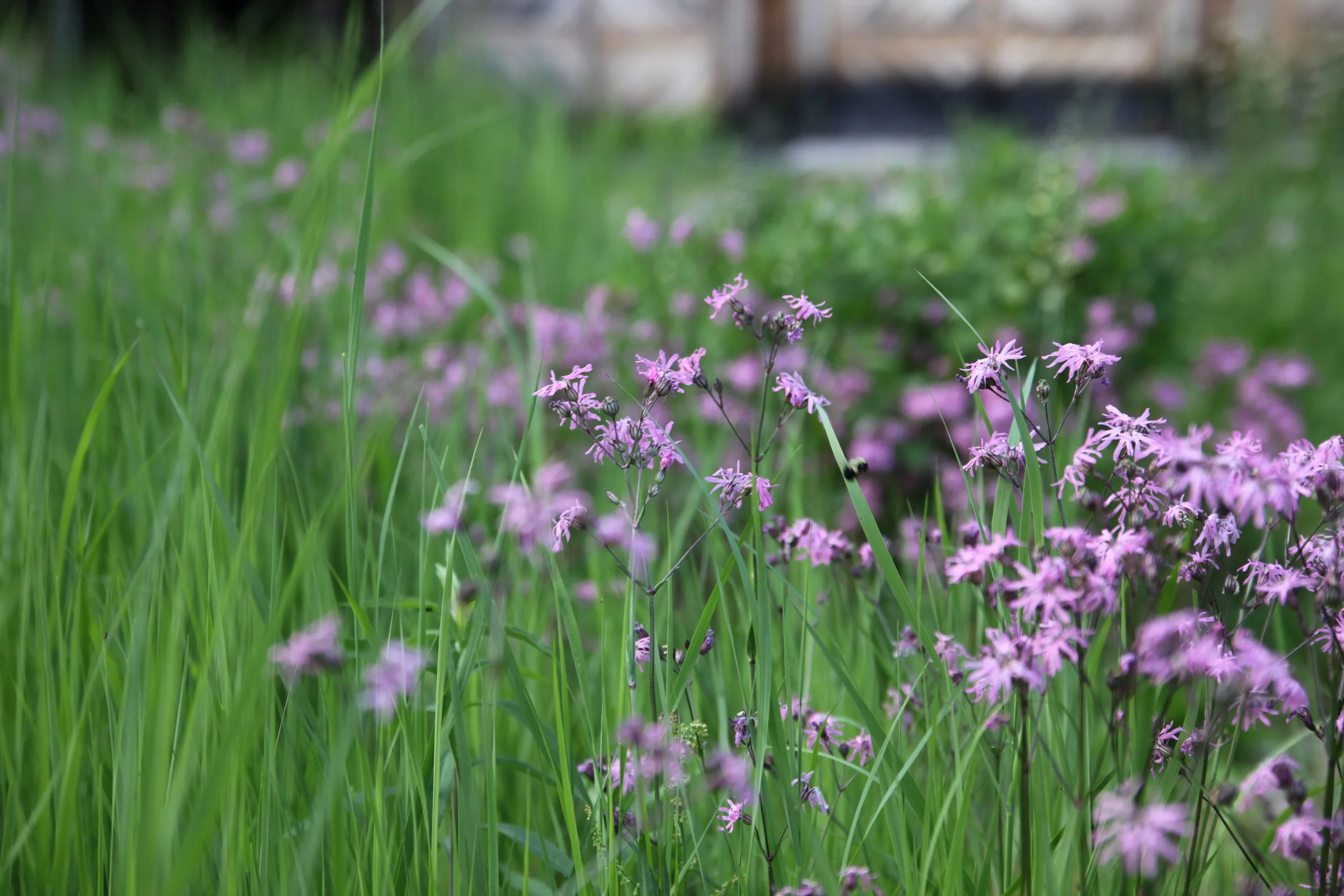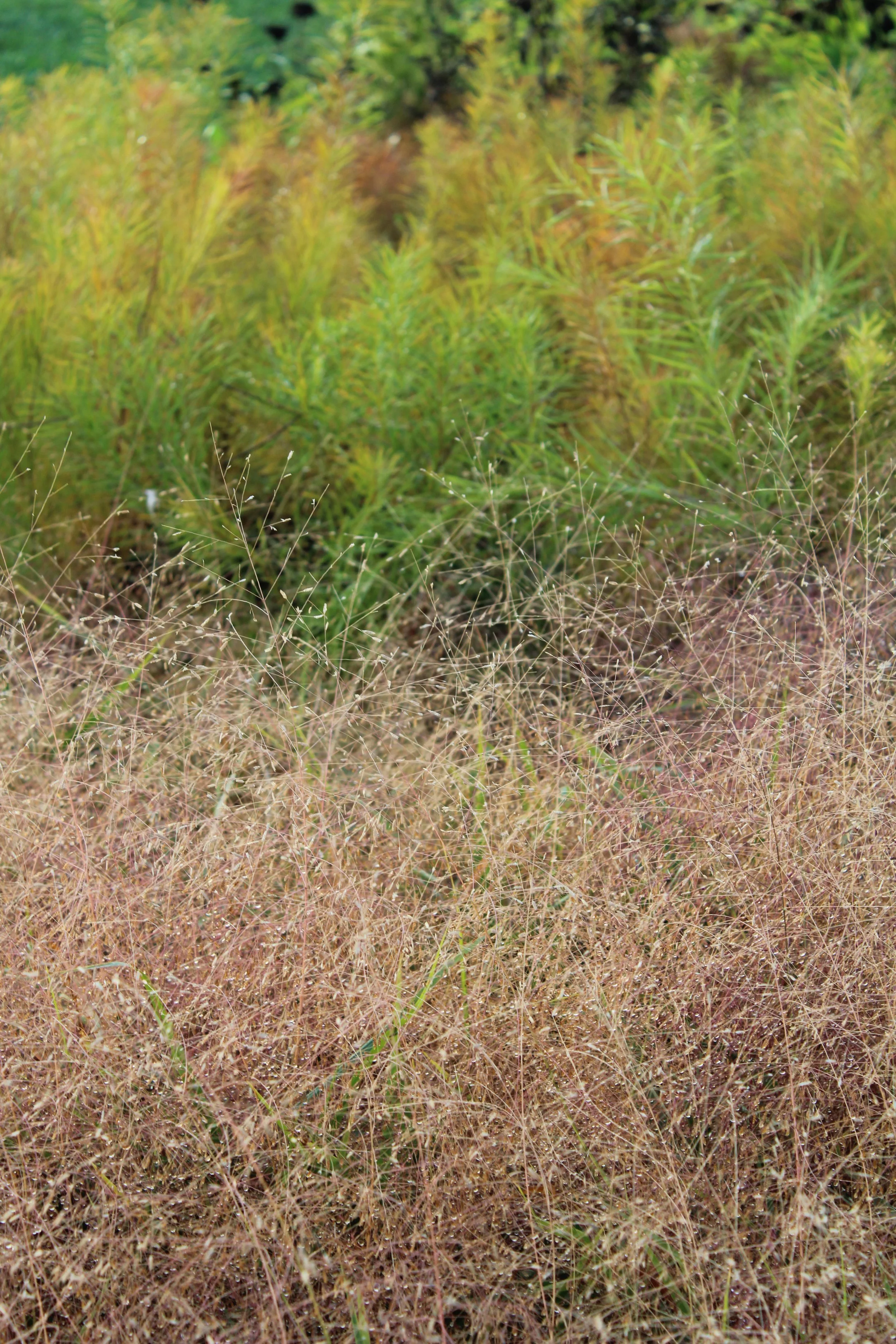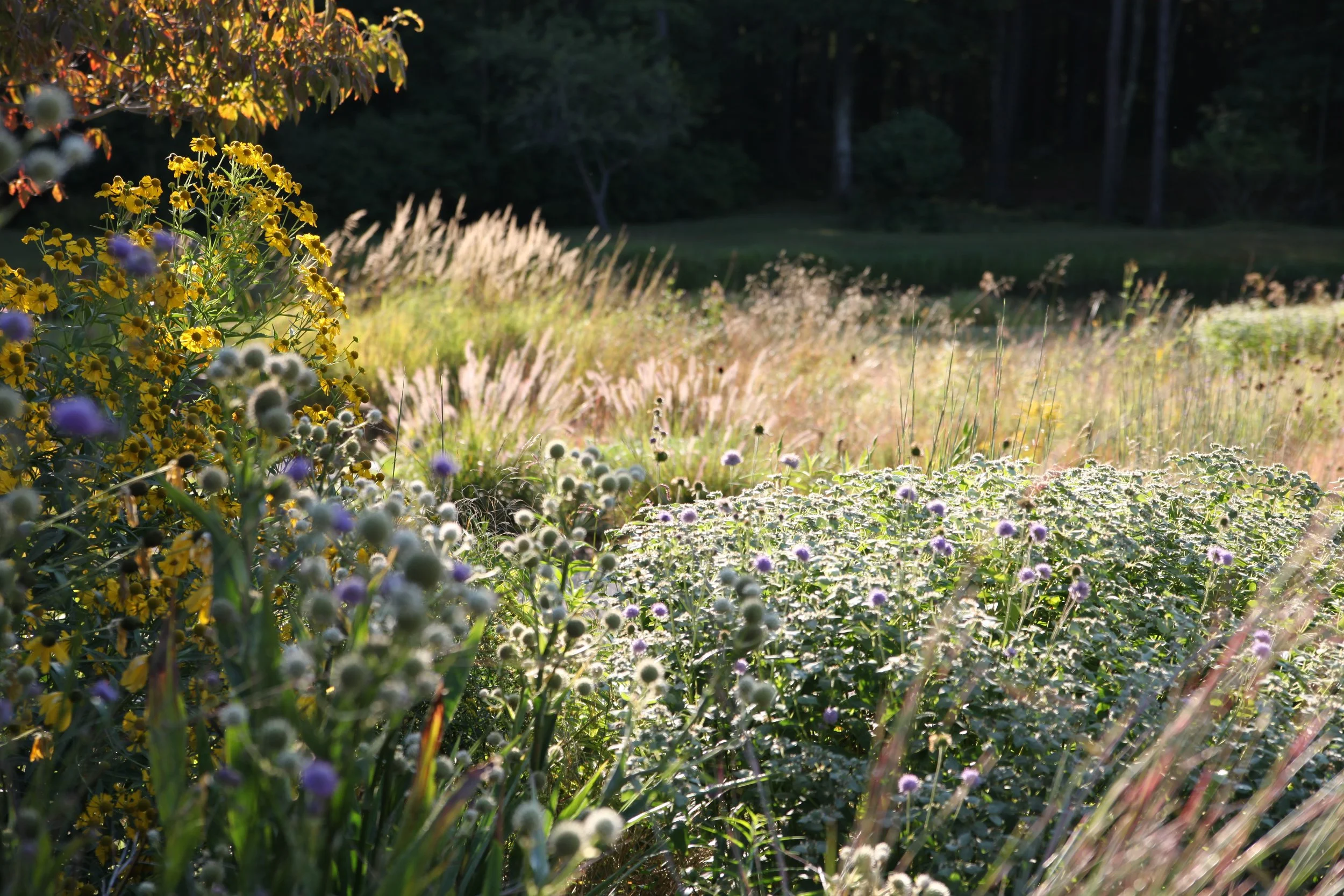 Aerial view of a backyard lawn that is being transformed into a naturalistic meadow with a winding path, surrounded by trees and houses.