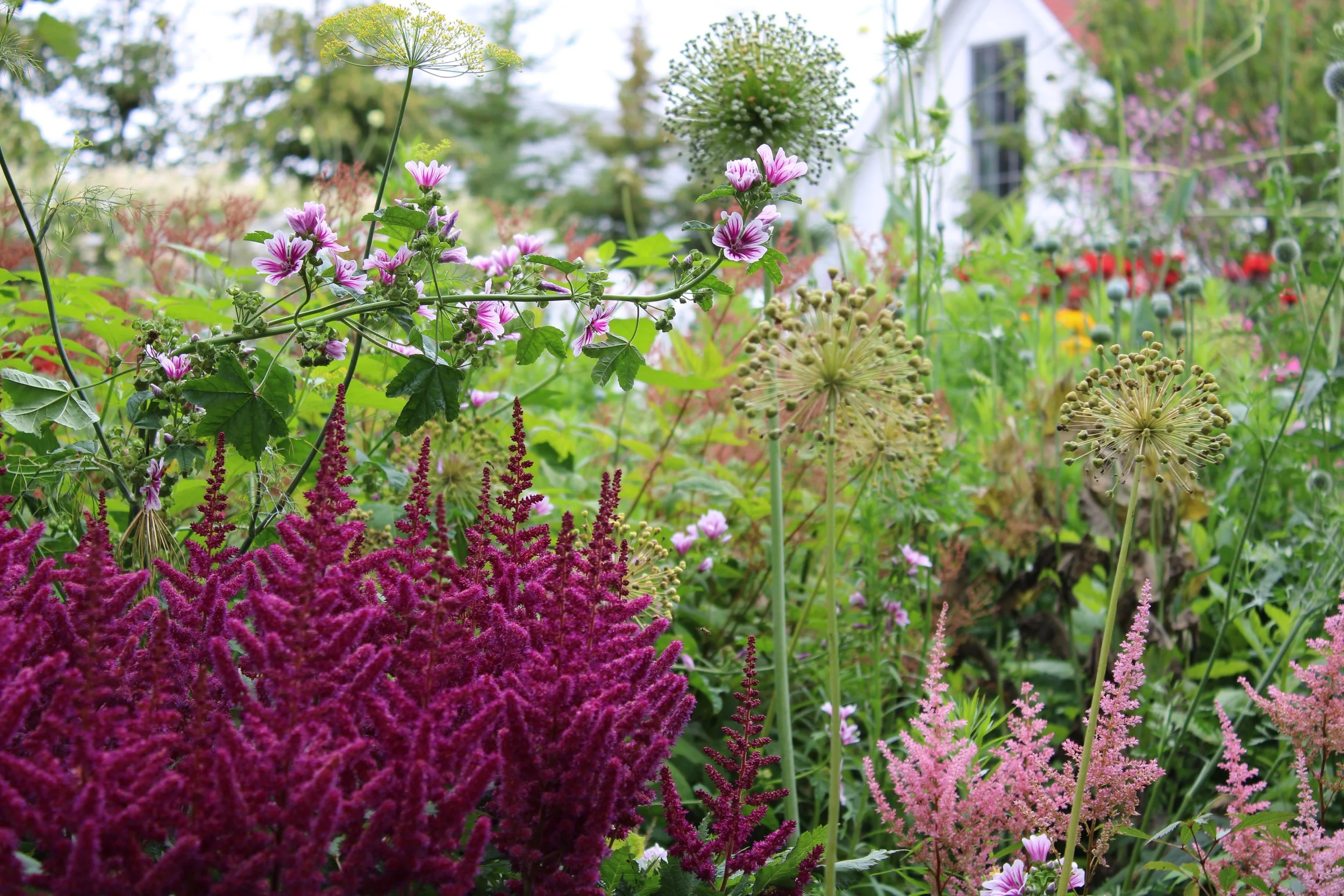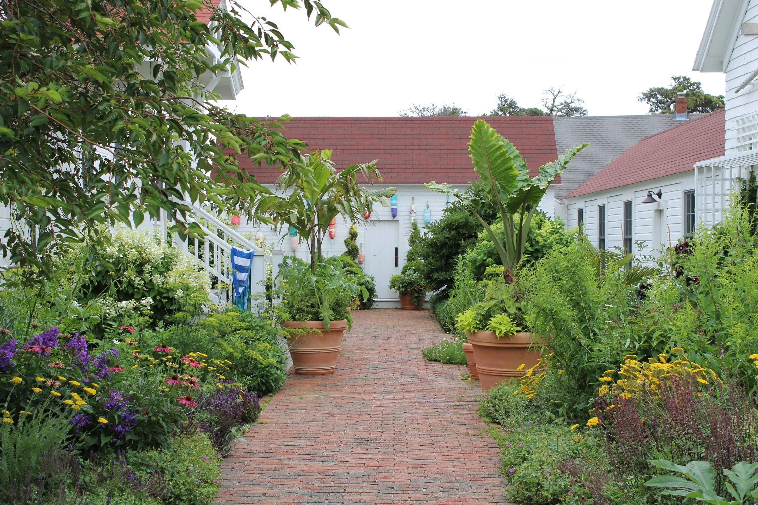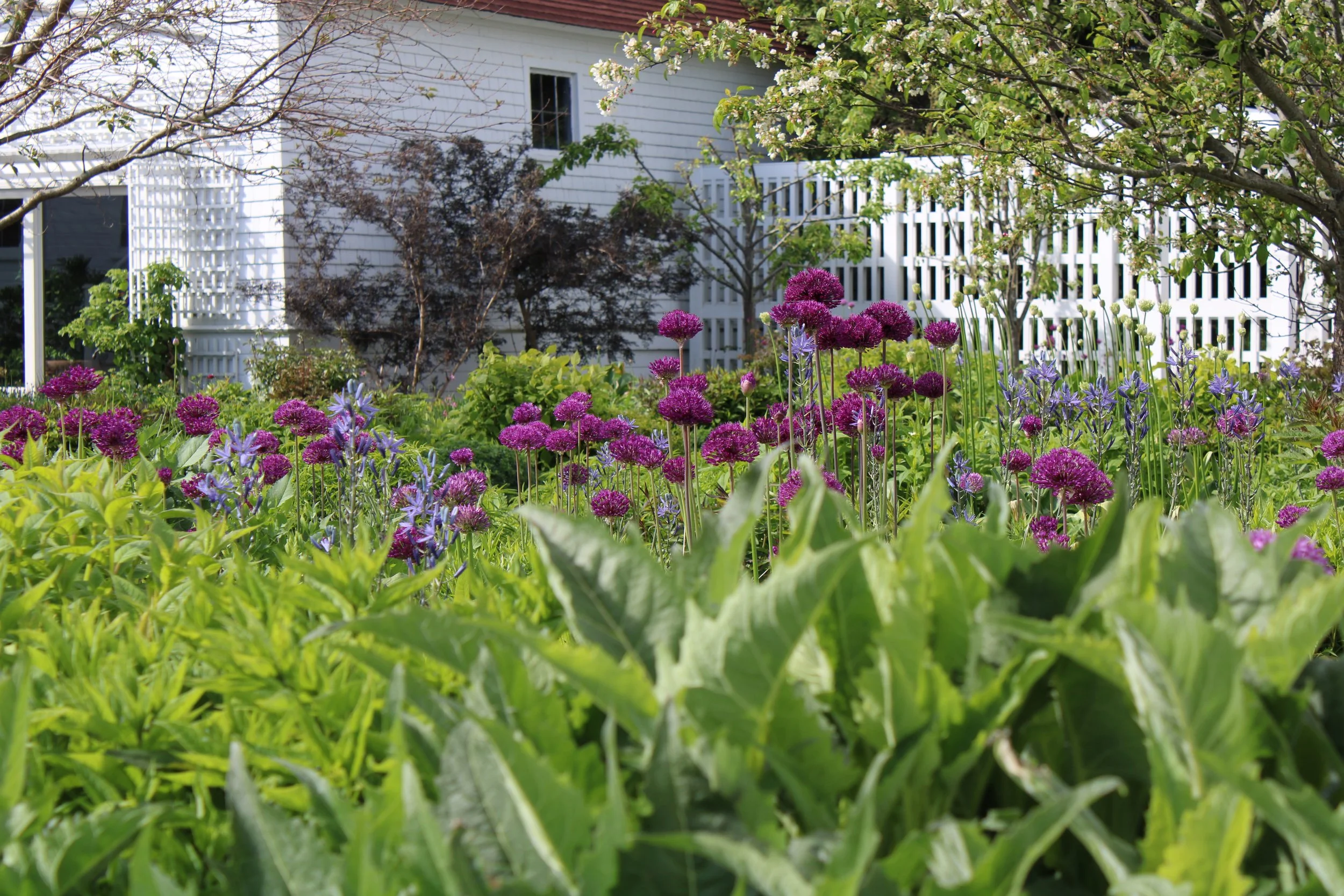 A watercolor sketch of a residential property layout showing multiple gardens, walkways, trees, and surrounding land.