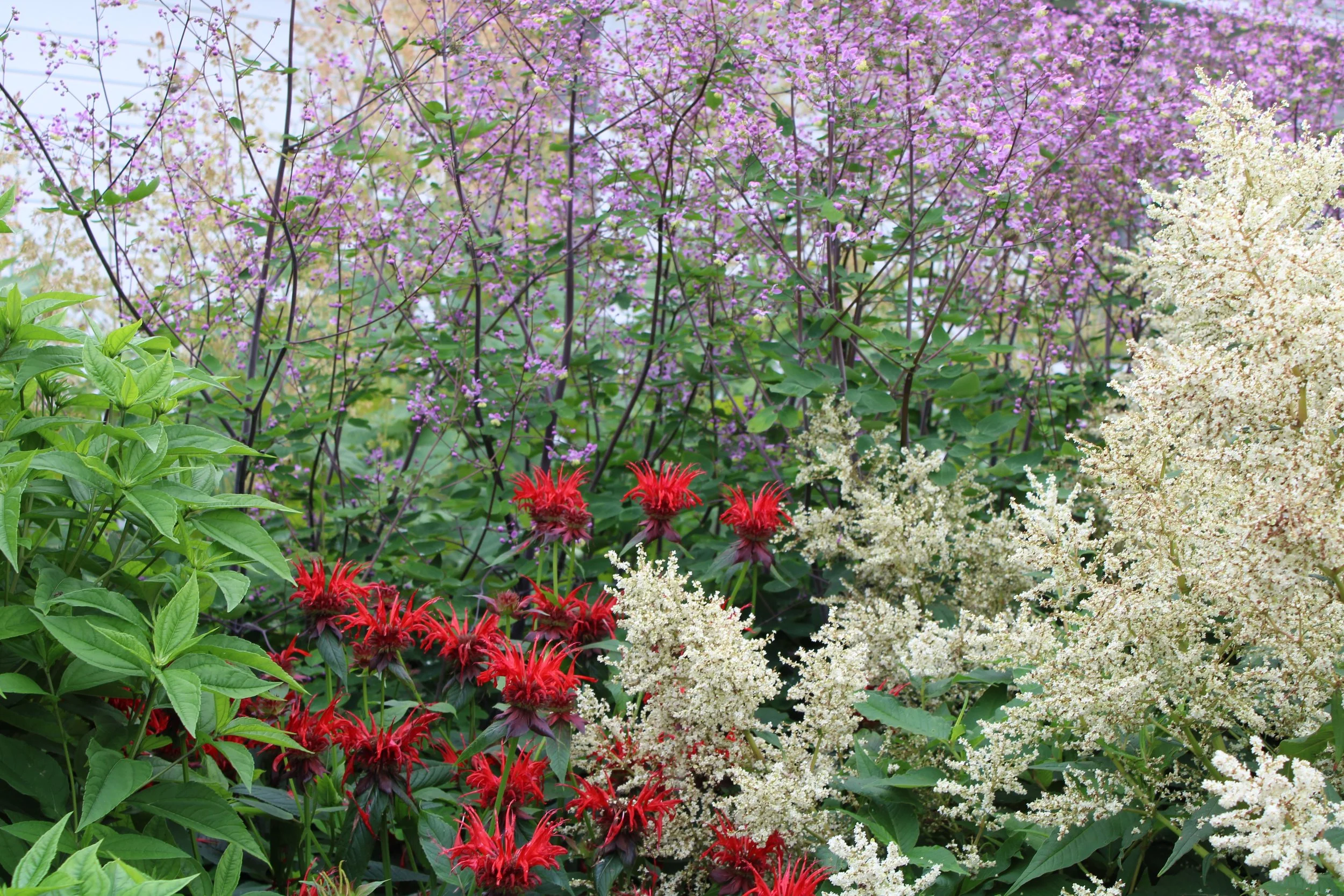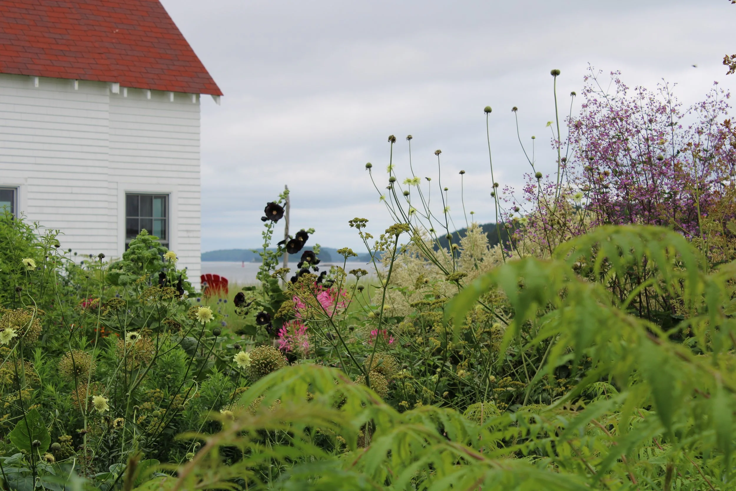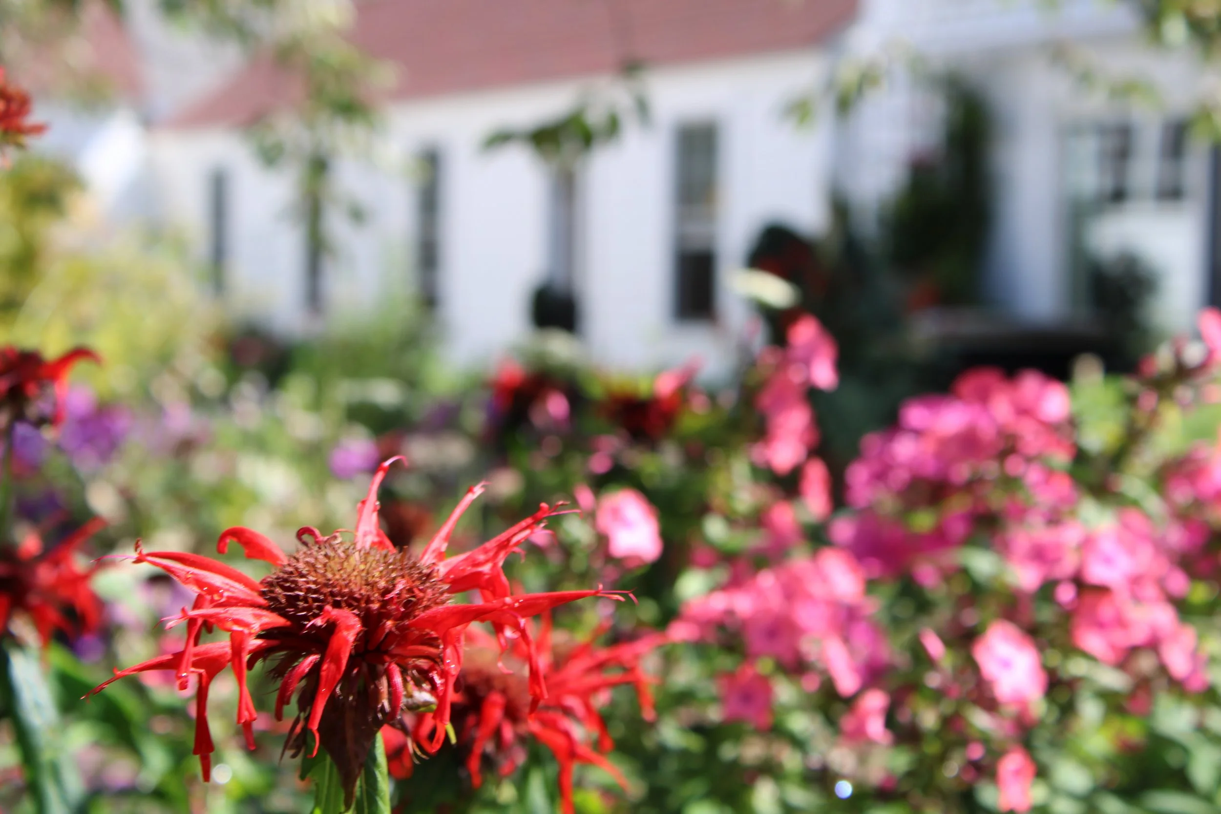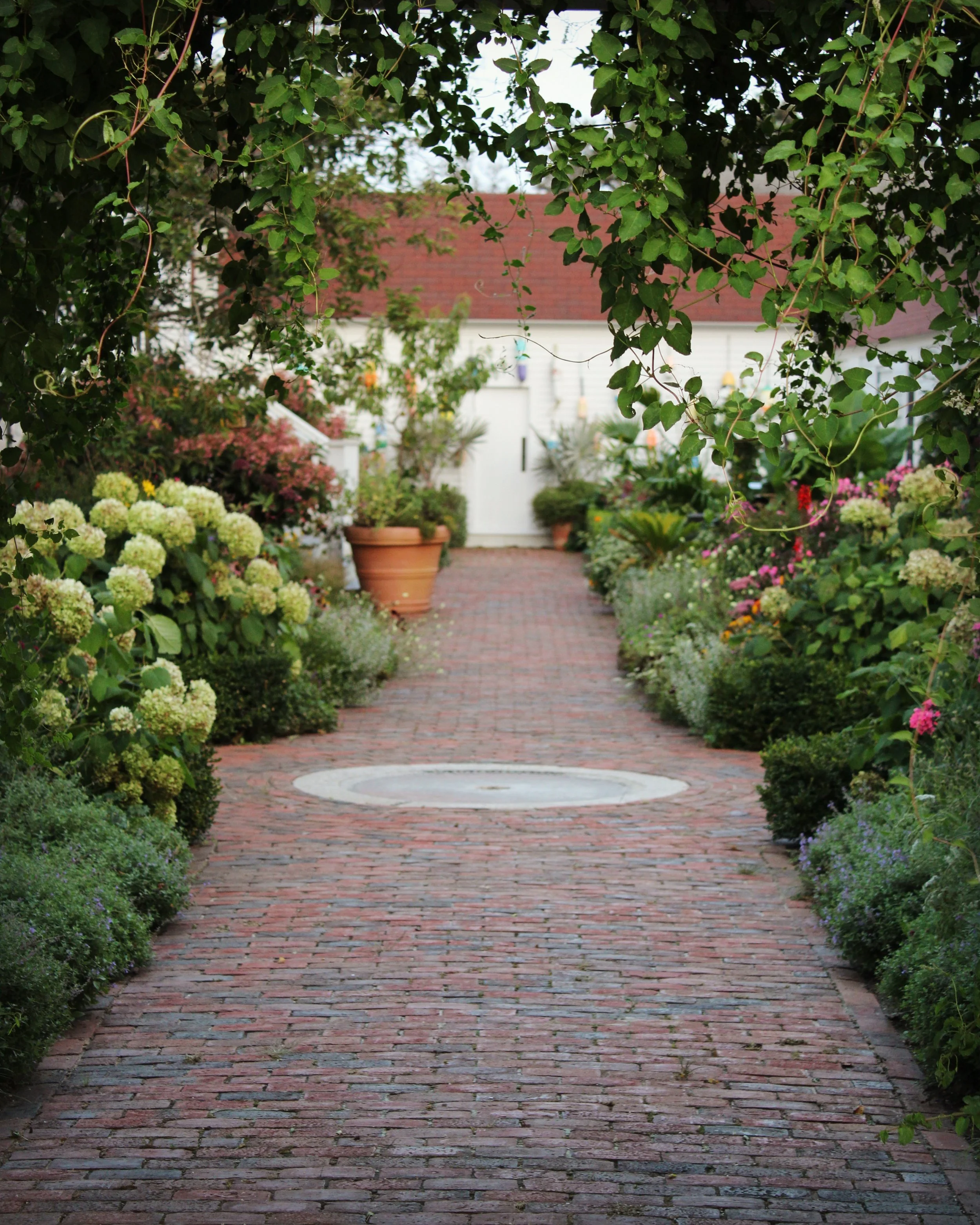 A watercolor sketch of a residential property layout showing multiple gardens, walkways, trees, and surrounding land.