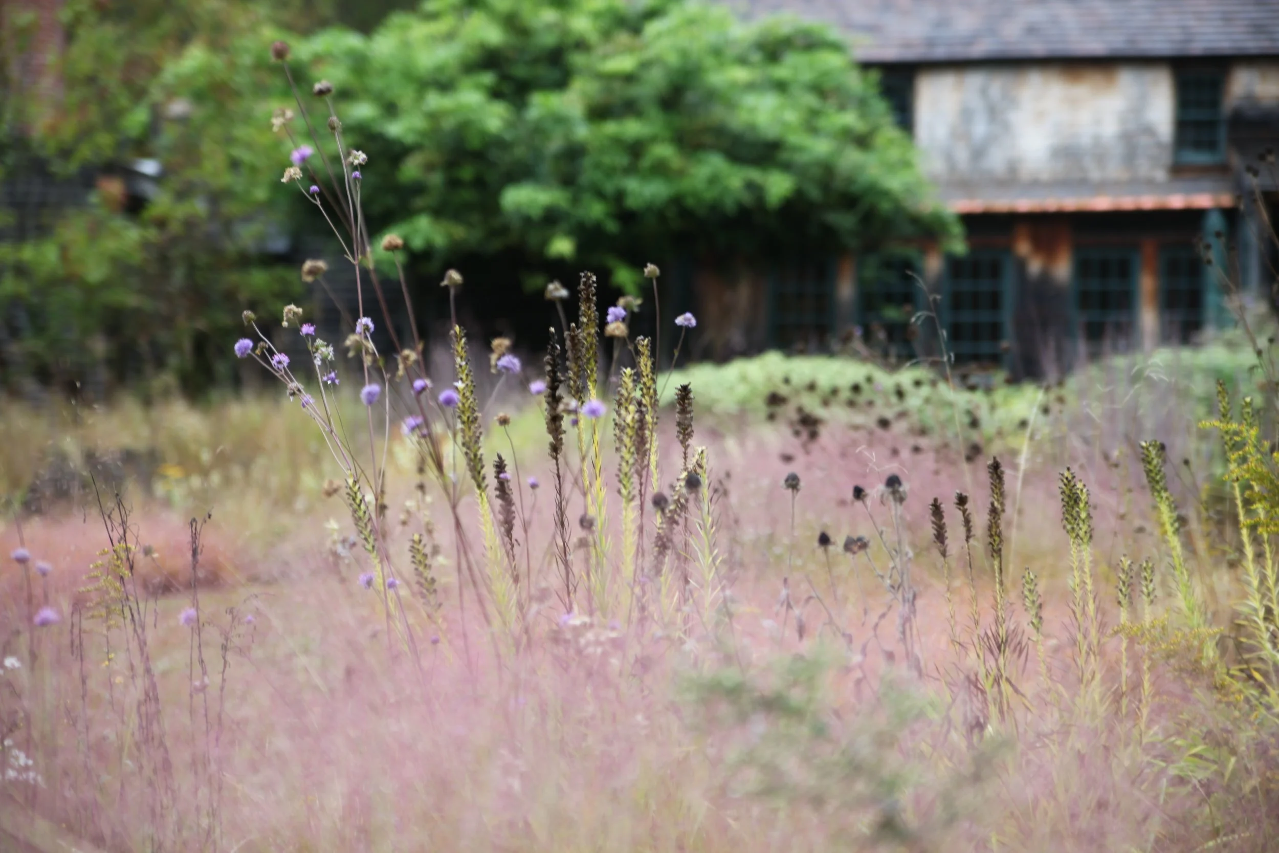 Pink and purple wildflowers growing in a field with a blurred background of a rustic house and green foliage.