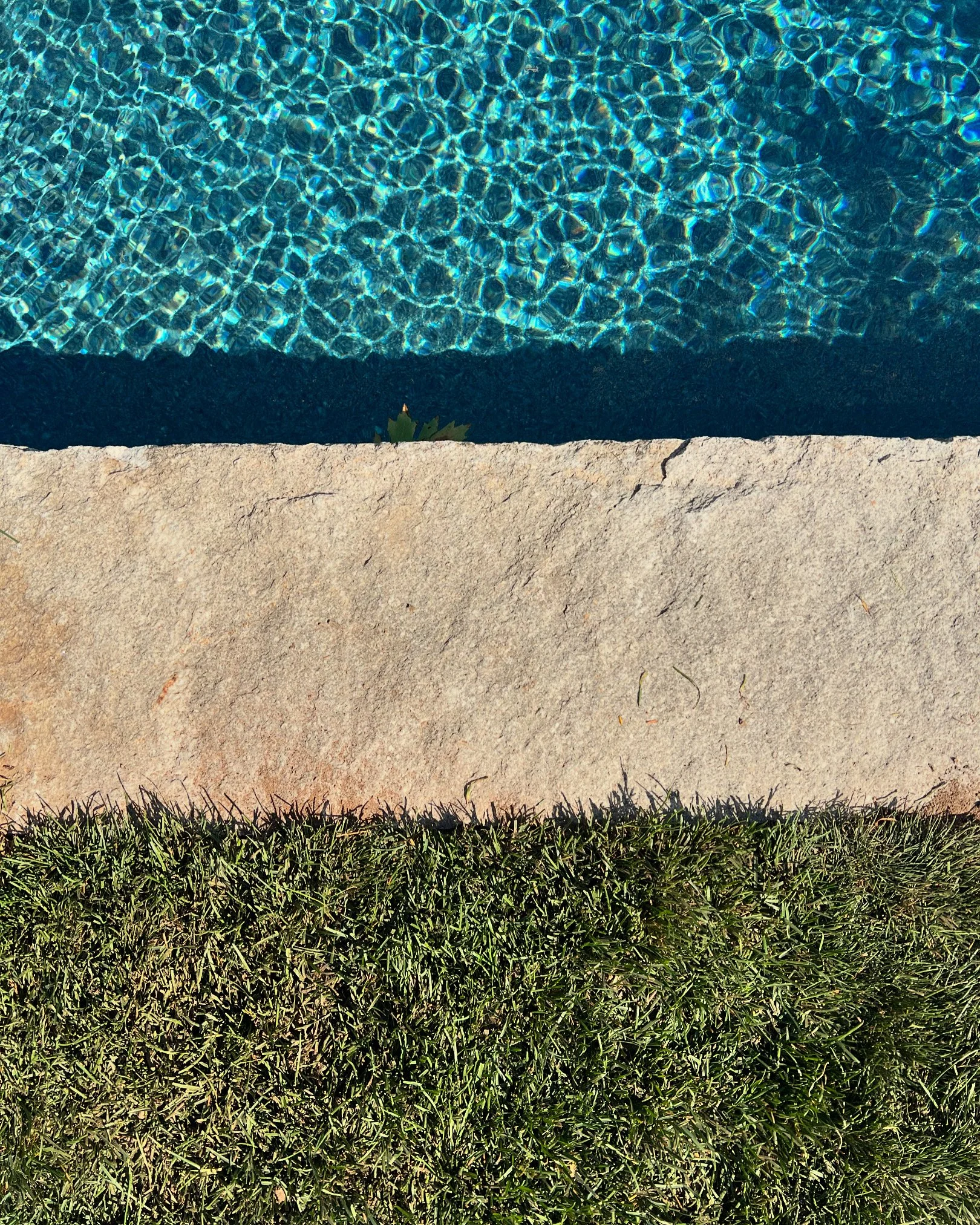 Top view of a swimming pool with clear blue water, a stone edge, and grass at the bottom.
