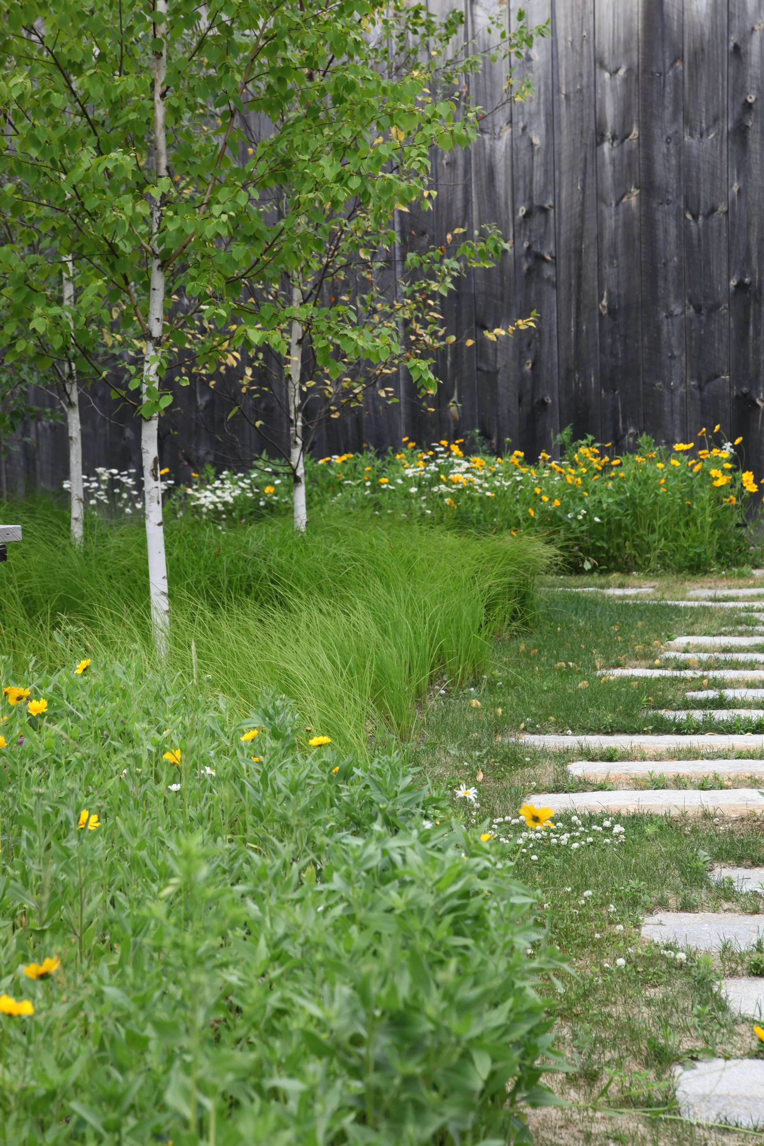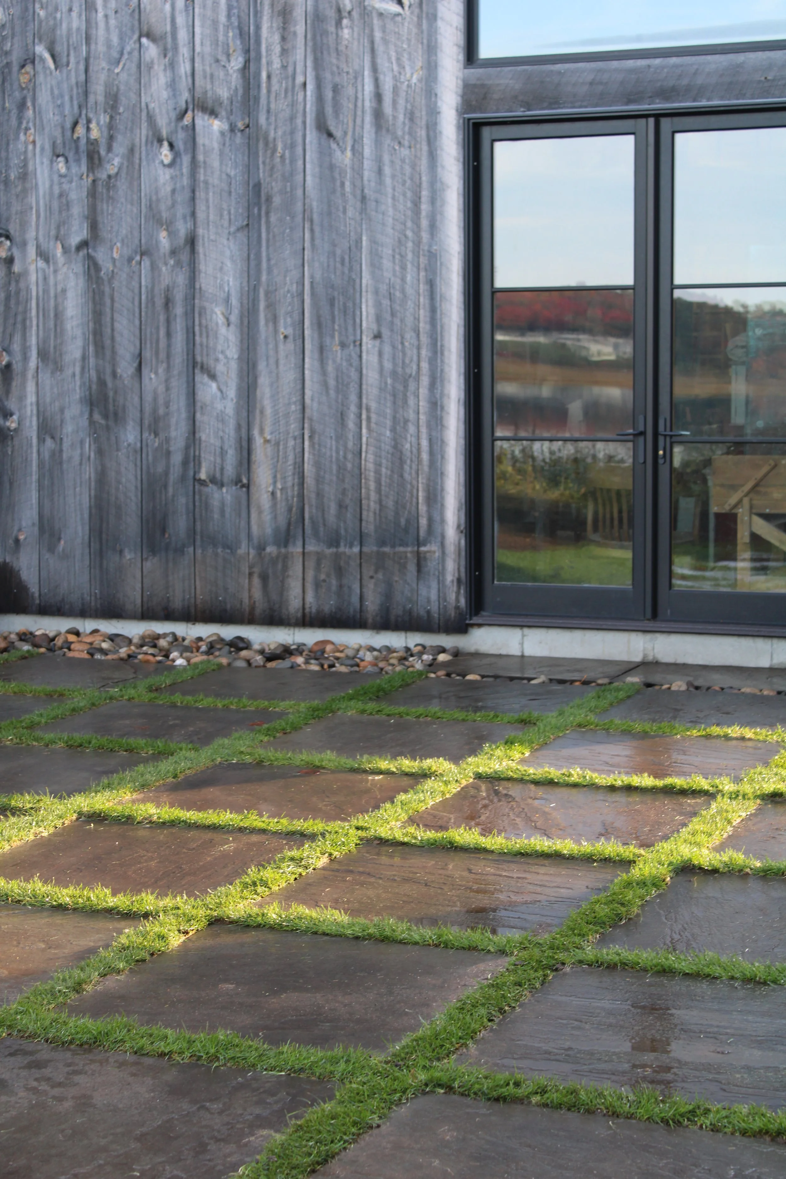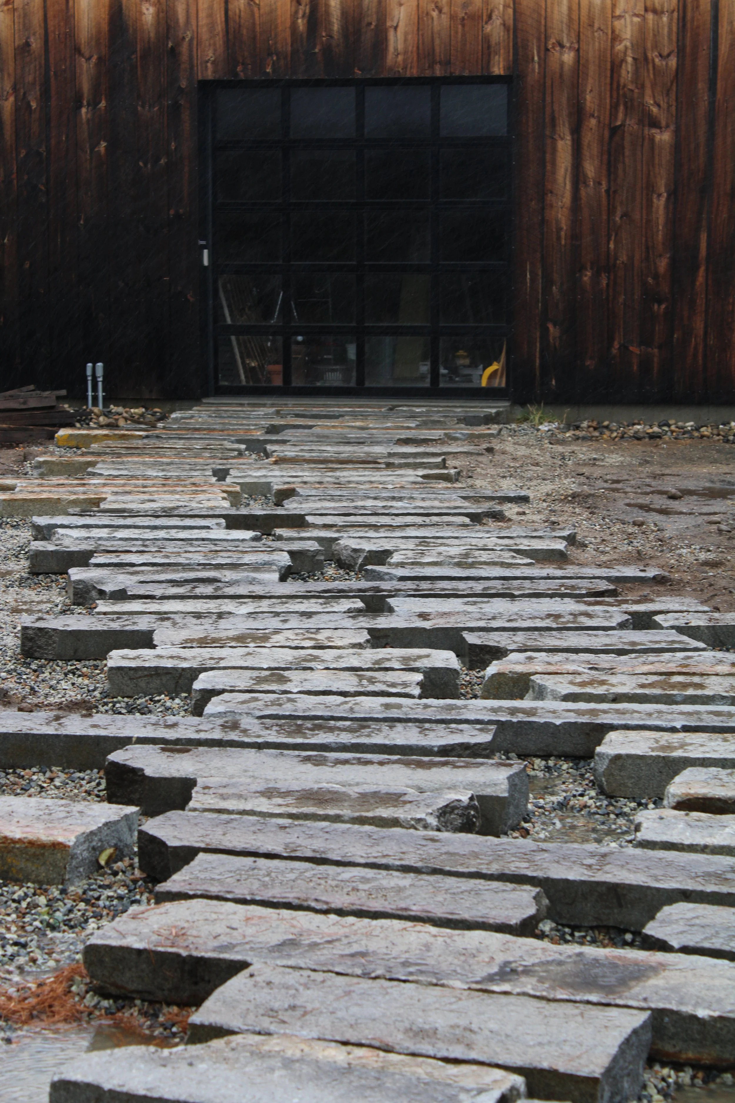 Hardscape plan showing reclaimed granite driveway, terrace, retaining wall, and existing bluestone for L terrace with various stone arrangements and structures.